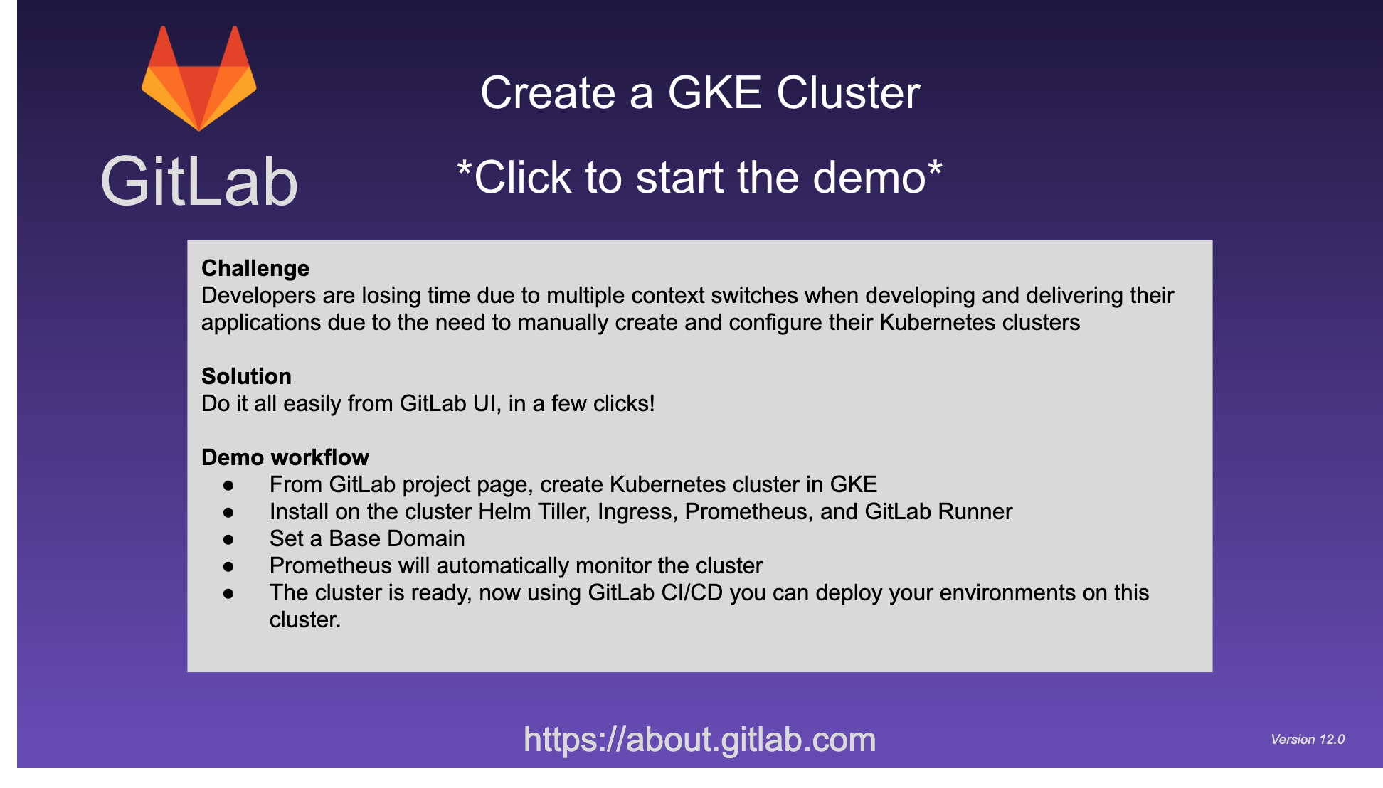 [G-slides file](https://docs.google.com/presentation/d/1UkQI_9V-CJZcbZJBDTB7tyOg14XHCKIwNoUHW1K6tC8/edit?usp=sharing) [Booth Demo Auto Play link](https://docs.google.com/presentation/d/e/2PACX-1vRQ4xltHhYRO_zgbo7exF6BwR09jvPmyFzR4XvjdlpYMRqT4dctx61XCkLjfR-8sq6QyOsoEFBBJjJh/pub?start=true&loop=true&delayms=3000) [Sales enablement recording](https://youtu.be/V_6bR0Kjju8)Auto DevOps - Setup (GKE) (Oct 2018 - 11.3)
