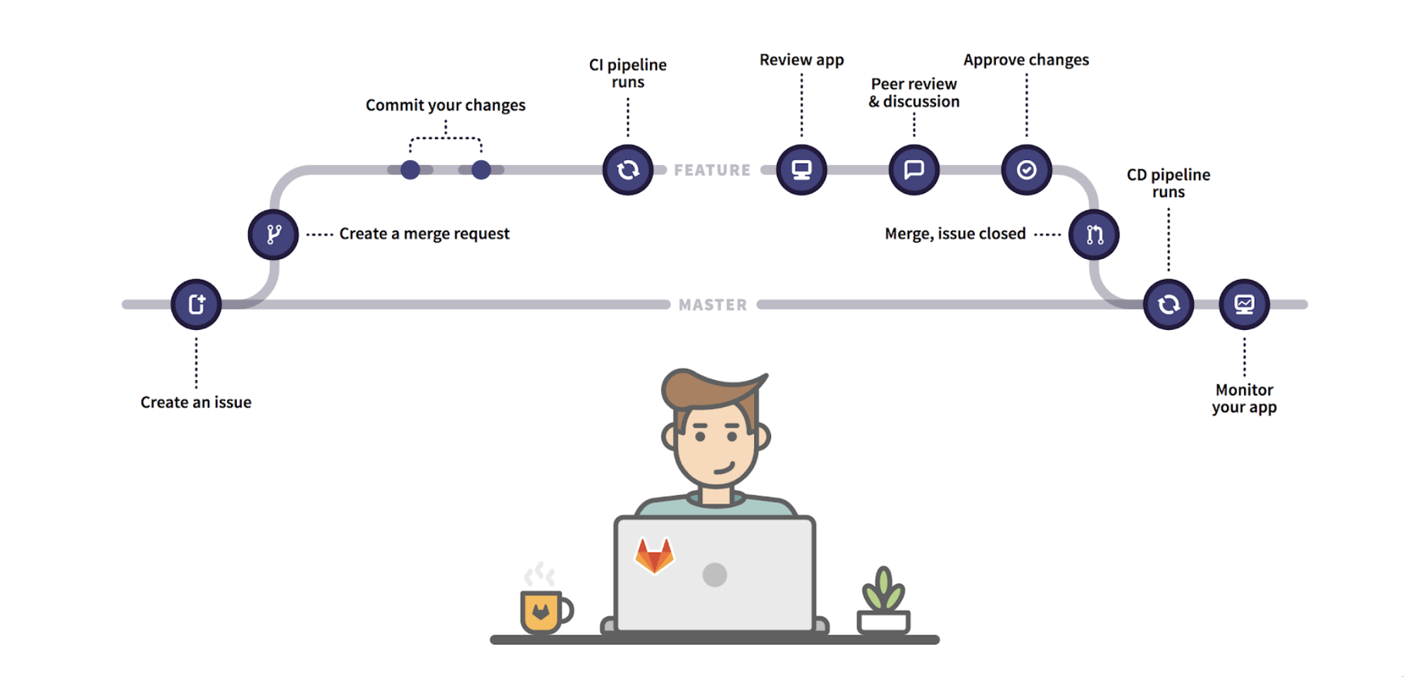 Highlights Denomas’s single platform for the complete DevOps lifecycle, from idea to production, through issues, planning, merge request, CI/CD, and monitoring.